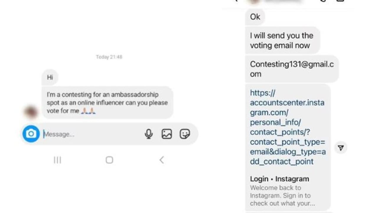 ஒரு கணக்கை குளோனிங் செய்த பிறகு, மோசமான நடிகர்கள் அசல் பயனரின் நண்பர்கள் மற்றும் பின்தொடர்பவர்களை அணுகுவார்கள். DM இல், அவர்கள் இந்த உரையைப் பகிர்ந்து கொள்கிறார்கள்: “வணக்கம். நான் ஒரு ஆன்லைன் செல்வாக்கு செலுத்துபவராக தூதர் பதவிக்கு போட்டியிடுகிறேன் [sic] நீங்கள் எனக்கு வாக்களிக்க முடியுமா” என்பது தான் அது.