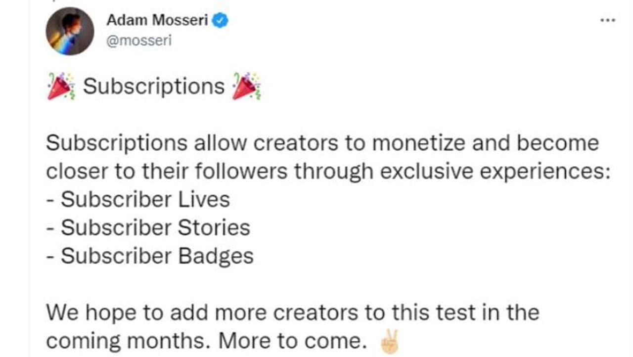 இன்ஸ்டாகிராம் தலைவர் ஆடம் மொசெரி "Subscriptions are for creators," எனும் தலைப்புடன் வீடியோ ஒன்றை தனது அதிகாரப்பூர்வ டுவிட்டர் பக்கத்தில் பதிவிட்டார். "சப்ஸ்கிரிப்ஷன்ஸ் மூலம் கிரியேட்டர்கள் தங்களின் நலம் விரும்பிகளுக்கு பிரத்யேக அனுபவம் வழங்கி அவர்களுடன் நெருக்கமாகலாம். சப்ஸ்கிரைபர் லைவ், சப்ஸ்கிரைபர் ஸ்டோரீஸ், சப்ஸ்கிரைபர் பேட்ஜஸ் என பலவிதங்களில் நலம்விரும்புகளுக்கு பிரத்யேக பதிவுகளை வழங்கலாம்," என அவர் தனது பதிவில் குறிப்பிட்டு இருக்கிறார்.