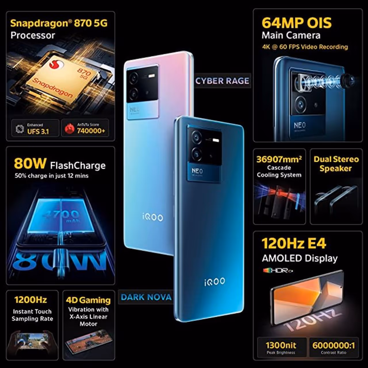 இன் டிஸ்ப்ளே கைரேகை சென்சார் கொண்டு இருக்கும் ஐகூ நியோ 6 ஸ்மார்ட்போனில் புகைப்படங்களை எடுக்க 64MP பிரைமரி கேமரா, 8MP அல்ட்ரா வைடு கேமரா, 2MP B&W போர்டிரெயிட் கேமரா, 16MP செல்பி கேமரா வழங்கப்பட்டு உள்ளது. இத்துடன் 4700mAh பேட்டரி, 80W பாஸ்ட் சார்ஜிங் வசதி வழங்கப்பட்டு உள்ளது.