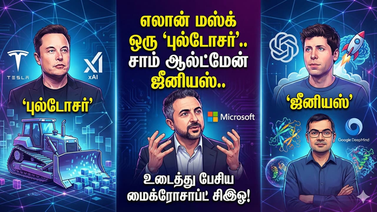 செயற்கை நுண்ணறிவு (AI) துறையில் ஜாம்பவான்களாகத் திகழும் தலைவர்களுக்கு இடையே எப்போதும் ஒருவிதமான போட்டி நிலவி வருகிறது. இந்நிலையில், மைக்ரோசாப்ட் நிறுவனத்தின் AI பிரிவு தலைமைச் செயல் அதிகாரியான (CEO) முஸ்தபா சுலைமான், தனது சக போட்டியாளர்களான எலான் மஸ்க், சாம் ஆல்ட்மேன் மற்றும் டெமிஸ் ஹசாபிஸ் ஆகியோர் குறித்து மிகவும் வெளிப்படையான கருத்துக்களைப் பகிர்ந்துள்ளார். ப்ளூம்பெர்க்கிற்கு அளித்த பேட்டியில் அவர் கூறிய சுவாரஸ்யமான தகவல்களை இங்கே காண்போம்.