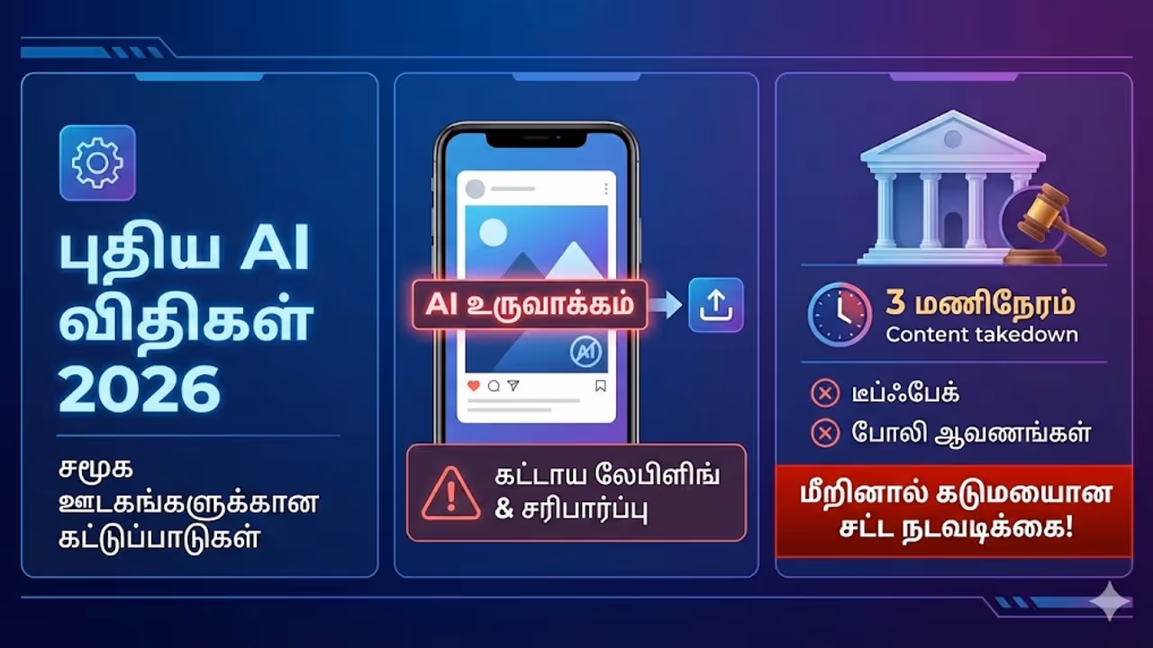 இன்றைய டிஜிட்டல் உலகில் சமூக வலைத்தளங்கள் நமது வாழ்க்கையின் ஒரு அங்கமாகவே மாறிவிட்டன. ஆனால், இனிமேல் அதில் நீங்கள் பகிரும் பதிவுகளில் (Content) கூடுதல் கவனம் தேவை. ஆம், ஏஐ (Artificial Intelligence) மூலம் உருவாக்கப்பட்ட பதிவுகளுக்கான புதிய கட்டுப்பாடுகளை மத்திய அரசு பிப்ரவரி 20, 2026 முதல் இந்தியாவில் அமல்படுத்தியுள்ளது.