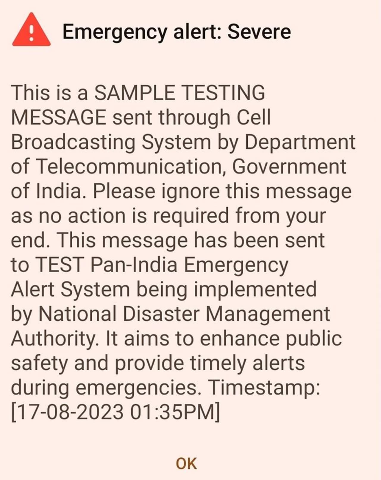 "இது இந்திய அரசின் தொலைத்தொடர்புத் துறையின் செல் பிராட்காஸ்டிங் அமைப்பு மூலம் அனுப்பப்பட்ட மாதிரி எச்சரிக்கை செய்தி ஆகும். இந்தச் செய்தியைப் பெற்றவர்கள் அதனைப் புறக்கணித்துவிடலாம். அந்தத் தகவலை முன்னிட்டு எந்த நடவடிக்கையும் தேவையில்லை. தேசிய பேரிடர் மேலாண்மை ஆணையம் இந்தச் செய்தி நாடு முழுவதும் அனுப்பப்பட்டுள்ளது. இது பொது பாதுகாப்பை மேம்படுத்துவதையும், அவசர காலங்களில் சரியான நேரத்தில் எச்சரிக்கைகளை வழங்குவதையும் நோக்கமாகக் கொண்டுள்ளது" என்று அந்த ஃபிளாஷ் மெசேஜில் குறிப்பிடப்பட்டுள்ளது.