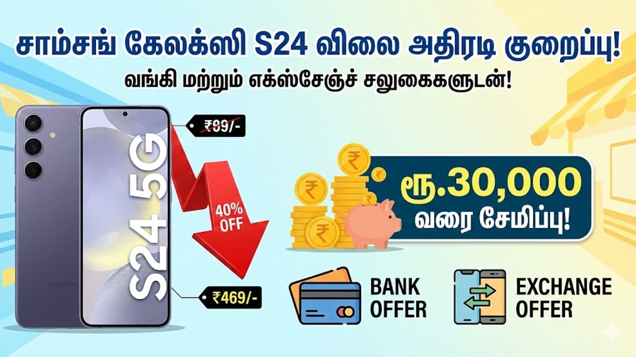Samsung பிளிப்கார்ட்டில் சாம்சங் கேலக்ஸி S24 5ஜி போனுக்கு 40% விலை குறைப்பு! வங்கி மற்றும் எக்ஸ்சேஞ்ச் சலுகைகள் மூலம் ரூ.30,000 வரை சேமிக்கலாம். வாங்க இதுவே சரியான நேரம்!