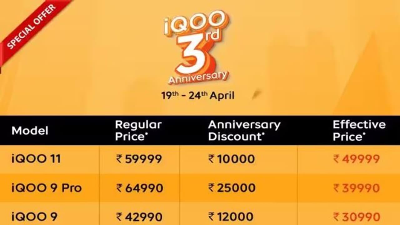 iQOO நிறுவனம் இந்தியாவில் மூன்று ஆண்டுகளைக் கொண்டாட இருப்பதை முன்னிட்டு, தனது ஃபிளாக்ஷிப், நியோ சீரிஸ் ஸ்மார்ட்போன்களில் பெரும் தள்ளுபடியை வழங்குகிறது. அதன் முழு விபரங்களை இங்கே பார்க்கலாம். ஏப்ரல் 19 முதல் ஏப்ரல் 24, 2023 வரை தள்ளுபடியை வழங்குகிறது.