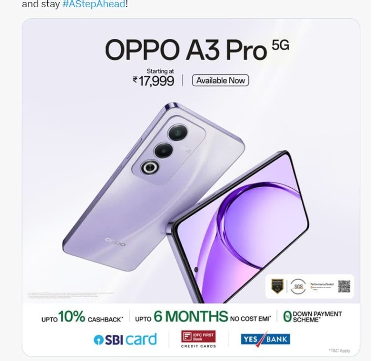 OPPO நிறுவனம் இந்திய ஸ்மார்ட்போன் சந்தையில் வாடிக்கையாளர்கள் மத்தியில் தனக்கென நற்பெயரைக் கொண்டது, ஓப்போவின் சமீபத்திய ஸ்மார்ட்போன் OPPO A3 Pro அதற்கு விதிவிலக்கல்ல. "ஒரு படி மேலே" என்ற உத்தரவாதத்துடன், OPPO பல புதுமைகளைச் செய்துள்ளது. இது பயனர்களுக்கு மேம்பட்ட பலனைத் தருகிறது. இந்த மொபைலின் 128GB வேரியண்ட் ரூ.17,999 மற்றும் 256GB வேரியண்ட் ரூ.19,999 என வசதியான விலையில் விற்பனைக்கு வந்துள்ளது. OPPO A3 Pro நீடித்து உழைக்கும் நீண்ட கால செயல்திறன் கொண்டதாக இருப்பதுடன் அதிநவீன வசதிகளுடன் ப்ரீமியம் வடிவமைப்பையும் பெற்றுள்ளது.