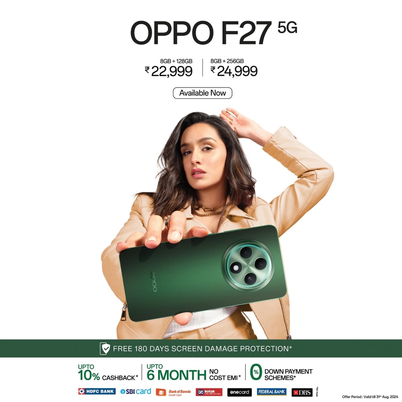 OPPO F27 5G 8GB+128GB வேரியண்ட்டின் விலை ரூ.22,999, 8GB+256GB வேரியண்ட்டின் விலை ரூ.24,999. ஏற்கனவே விற்பனைக்கு வந்துவிட்ட இந்த ஸ்மார்ட்போன், Flipkart, Amazon மற்றும் OPPO e-Store களில் கிடைக்கும். ஆஃப்லைனிலும் மொபைல் ஷோரூம்களில் கிடைக்கும். இந்த மொபைலை வாங்கும் வாடிக்கையாளர்களுக்கு பல்வேறு சிறப்புச் சலுகைகளும் உள்ளன.