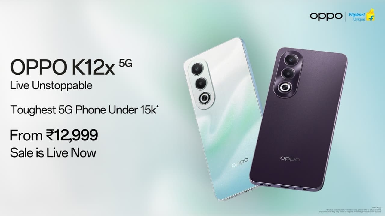 OPPO K12x 5G மொபைலின் விலை ரூ.12,999 (6GB+128GB) மற்றும் ரூ.15,999 (8GB+256GB) விலையில் கிடைக்கும். பிளிப்கார்ட் (Flipkart), ஓப்போ இ-ஸ்டோர் மற்றும் மொபைல் ஷோரும்களில் இந்த மொபைல் விற்பனைக்கு உள்ளது.