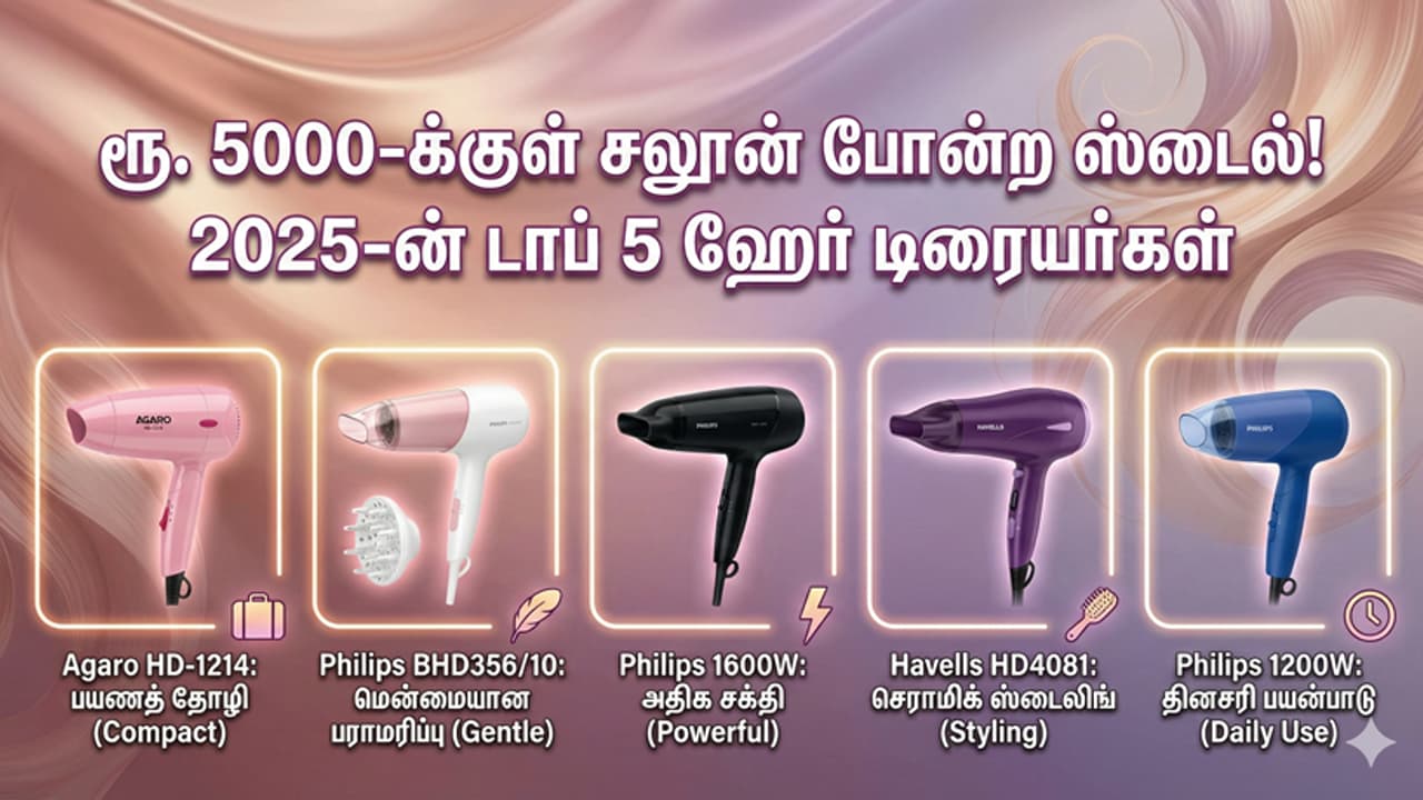 இன்றைய நவீன உலகில் தலைமுடி பராமரிப்பு என்பது அன்றாட வாழ்க்கையின் ஒரு முக்கிய அங்கமாகிவிட்டது. குறிப்பாக, பணிக்குச் செல்லும் பெண்கள் மற்றும் கல்லூரி மாணவிகளுக்கு நேரத்தை மிச்சப்படுத்தவும், தலைமுடியை அழகாக பராமரிக்கவும் ஒரு சிறந்த ஹேர் டிரையர் (Hair Dryer) அவசியம். 2025 ஆம் ஆண்டில், பட்ஜெட் விலையில் அதாவது ரூ. 5,000-க்குள் கிடைக்கும் சிறந்த ஹேர் டிரையர்கள் எவை என்பதை இங்கே விரிவாகப் பார்ப்போம்.