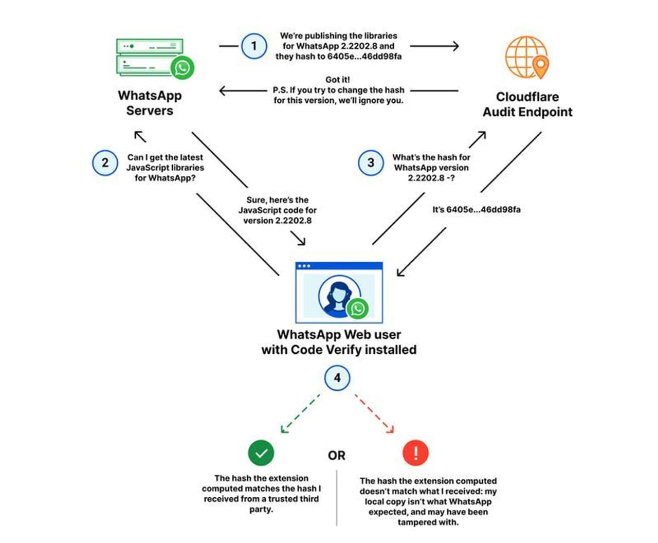 வாட்ஸ்அப் செயலியில் வழங்கப்பட இருக்கும் கோட் வெரிஃபை அம்சம் அதன் வெப் வெர்ஷனில் பாதுகாப்பை உறுதிப்படுத்தும் வகையில் உருவாக்கப்பட்டு இருக்கிறது. கோட் வெரிஃபை அம்சம் வாட்ஸ்அப் வெப் வெர்ஷன் பாதுகாப்பாக இருக்கிறதா, அதன் எண்ட்-டு-எண்ட் என்க்ரிப்ஷன் பாதிக்கப்படாமல் இயங்குகிறதா என்பதை உறுதிப்படுத்துகிறது. இந்த அம்சம் வாட்ஸ்அப் மற்றும் கிளவுட்ஃபிளேர் கூட்டணியின் கீழ் வழங்கப்பட்டு இருக்கிறது.