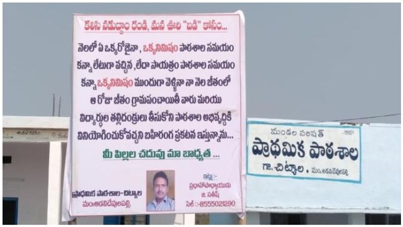 பள்ளிக்காக தனது சம்பளப்பணத்தில் ஒரு பகுதியை செலவழித்து டாய்லெட் கட்டுவது உட்பட பல நல்ல காரியங்களை செய்துவரும் சதீஷ் குழந்தைகள் தாமதமாகப் பள்ளிக்கு வருவதைத் தடுப்பதற்காக ஒரு யோசனை செய்தார். அதன்படி பள்ளியின் முகப்பில் கடந்த மார்ச் மாதம் ஒரு போர்டைக் கட்டித்தொங்கவிட்டார். அந்த போர்டில்... தலைமை ஆசிரியராகிய நான் பள்ளிக்கு ஒரு நிமிடம் தாமதமாக வந்தாலோ ஒரு நிமிடம் சீக்கிரம் சென்றாலோ என்னுடைய அன்றைய சம்பளத்தை [ரூ.1300] மாணவர்களின் நலன் நிதிக்காக ஊர்ப் பஞ்சாயத்துத் தலைவரிடம் ஒப்படைத்து விடுகிறேன்’ என்று குறிப்பிட்டிருக்கிறார்.