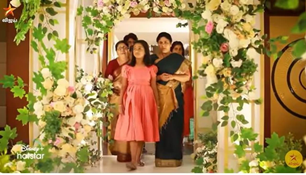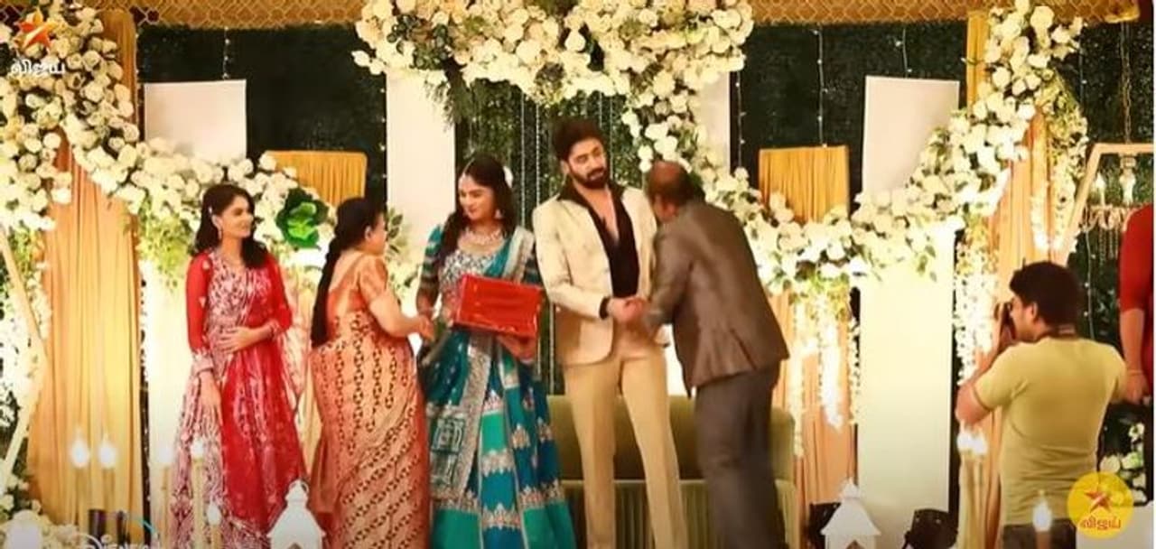 விஜய்யின் குடும்பம் விஜய் காவேரிக்கும் திருமண வரவேற்பு நடத்த சாரதா வர மாறுக்கிறார்.