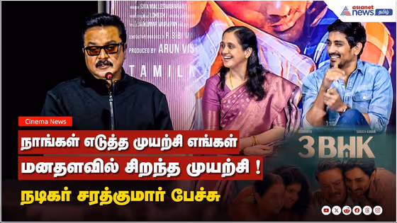 3BHK Movie Thanks Giving Meet :நாங்கள் எடுத்தக் கொண்ட முயற்சி எங்கள் மனதளவில் சிறந்த முயற்சி . இந்த படத்தை முதலில் நம் பத்திரிகை நண்பர்களுக்கு போட்டு காமித்தோம் . அவர்களுக்கு என்னுடைய நன்றியை தெரிவித்துக்கொள்கிறேன் - நடிகர் சரத்குமார் பேச்சு