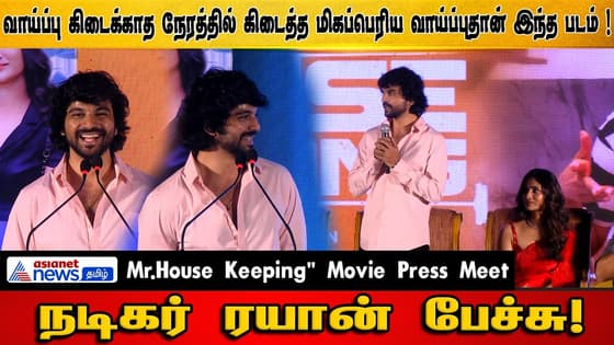 Mr.House Keeping" Movie Press Meet :முதலில் முரளி சார் மற்றும் நித்தின் சார் அவரக்ளுக்கு மிகவும் நன்றி ..என்னை நம்பி இந்த வாய்ப்பு கொடுத்ததற்கு .நான் வாய்ப்புக்காக தேடிகொண்டுடிருக்கும்போது கிடைத்த மிகப்பெரிய வாய்ப்புதான் இந்த ஹவுஸ் கீப்பிங் படம் . இந்த வாய்ப்பு கொடுத்த அனைவர்க்கும் மிகவும் நன்றி என்று பிக்பாஸ் நிகழ்ச்சியில் கலந்துகொண்டு கடைசிவரை இருந்து வந்த நடிகர் ரயான் அவர்களின் பேச்சு !