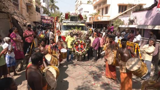 சிவ வாத்தியங்கள் முழங்க நகைச்சுவை நடிகர் மயில்சாமியின் இறுதி ஊர்வலம் நடைபெற்று வரும் நிலையில், அதன் வீடியோ காட்சிகள் வெளியாகி உள்ளது.