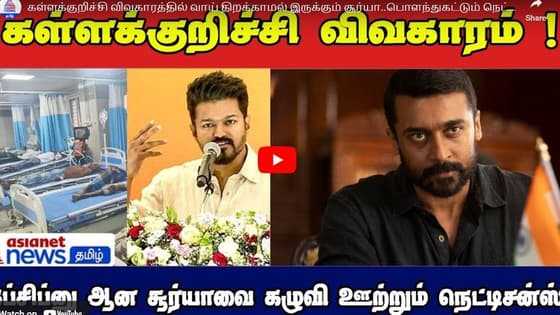 கள்ளக்குறிச்சி மாவட்டம் கருணாபுரம் பகுதியில் கள்ளச்சாராயம் குடித்ததில், இதுவரை 39 பேர் உயிரிழந்துள்ளனர். 70க்கும் மேற்பட்டோர் தீவிர சிகிச்சைப் பிரிவில் அனுமதிக்கப்பட்டு சிகிச்சை பெற்று வருகிறார்கள். தமிழகத்தையே கொந்தளிக்க வைத்துள்ள இந்த விவகாரம் குறித்து... எப்போதும், சமூக அக்கறையோடு பேசும் சூர்யா ஏன் இன்னும் வாய்திறக்கவில்லை நெட்டிசன்கள் கேள்வி எழுப்பி வருகிறார்கள்.