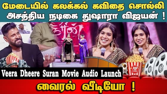 Veera Dheere Suran Movie Audio Launch : நடிகை துஷாரா விஜயன் பேசுகையில் ...இந்த படம் எனக்கு மிக பெரிய வாய்ப்பு ...இந்த படம் முழுவதுமே எனக்கு நல்ல நினைவுகளாக அமைந்தது . படக்குழுவினரரும் அனைவரும் குடும்பமாக இருந்தனர் ...மேலும் இவர்களுடன் படம் படிக்க நான் ஆசைப்படுகிறேன் . பிறகு நடிகர் விக்ரம் பார்த்து கவிதைகள் சொல்லி கலகலப்பாக பேசினார் நடிகை துஷாரா விஜயன் . இவர் சொன்ன கவிதைகள் தற்போது வைரலாகி வருகிறது .