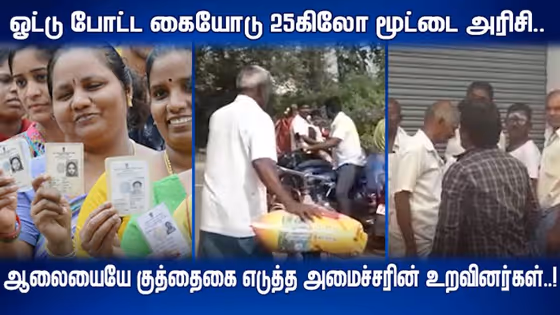 ஓட்டு போட்ட கையேடு 25 கிலோ அரிசி மூட்டை..ஆலையையே குத்தைகைக்கு எடுத்த அமைச்சரின் உறவினர்கள்..! அலைமோதிய கூட்டம் வீடியோ..!