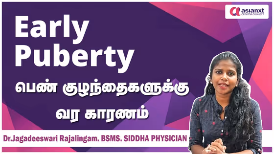 Hi im DrJagadeeswariRajalingam.BSMS.,Founder of DrJagadeeswari siddha clinic, 2210 Mariyal,NK road, Thanjavur-613006PH 7826940928.பெண் குழந்தைகள் சீக்கிரம் வயதுக்கு வர (Puberty) ஊட்டச்சத்து உணவுகள் குறைந்துவிட்டது என்று தான் சொல்ல வேண்டும். பெரும்பாலும் ஜங்க் ஃபுட், ஃபாஸ்ட் புட் என்று உணவு முறையை மாறிவிட்டது. துரித உணவுகள் எல்லாமே ஹார்மோன் மாற்றத்தை வேகமாக ஊக்குவிக்க கூடியவை. இது குறித்து முழு விவரம் இந்த வீடியோவில் பார்க்கலாம் .