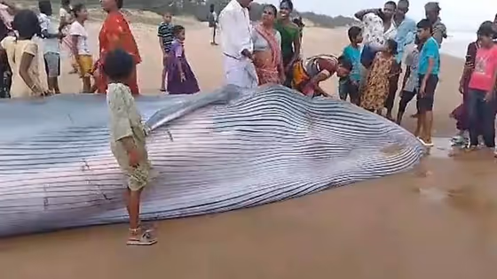 ஆந்திர பிரதேசம், ஶ்ரீகாகுளம் மாவட்டத்தில் மேகவரம் கடற்கரை பகுதியில் ஒரு நீலத்திமிங்கலம் கரை ஒதுங்கியுள்ளது. சுமார 25 அடி நீளமும், 5 டன் எடையும் கொண்ட அரிய வகை திமிங்கலம் என மீனவர்கள் தெரிவித்துள்ளனர். ஏராளமான மக்கள் திமிங்கிலத்தை காண வந்து செல்கின்றனர்.