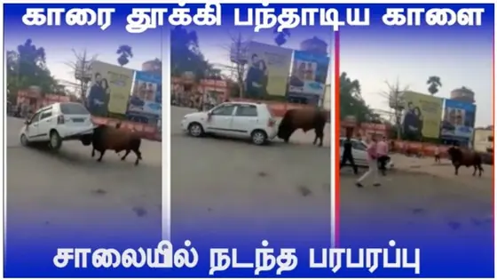 ஆக்ரோஷத்தில் காரை தூக்கி பந்தாடிய காளை.. சாலையில் நடந்த பரபரப்பு வீடியோ..!