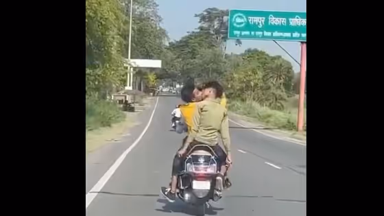 உத்தரபிரதேச மாநிலம், ராம்பூரில் இருந்து அந்த வைரல் வீடியோ வந்ததாக கூறப்படுகிறது. ஒரே ஸ்கூட்டியில் 3 பேர் செல்கின்றனர். அதில் ஒருவர் வாகன் ஓட்ட, மற்ற இருவர் தங்களை மறந்து முத்தமிட்டுக்கொள்ளம் காட்சி இருக்கிறது. சமூக வலைத்தளங்களில் இந்த வீடியோ வைரலானதைத் தொடர்ந்து, போலீசார் அந்த நபர்களை தேடி வருகின்றனர்.
