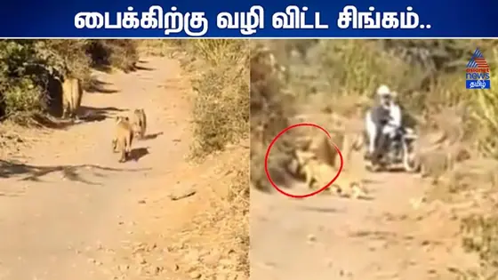 பைக்கிற்கு வழிவிட்ட சிங்கம்..இணையத்தில் வைரலாகும் வீடியோ..!
