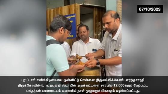 சென்னை பார்த்தசாரதி கோவிலில் புரட்டாசி சனிக்கிழமையை முன்னிட்டு தொகுதி சட்டமன்ற உறுப்பினரும், அமைச்சருமான உதயநிதி ஸ்டாலின் அறக்கட்டளை சார்பில் 12 ஆயிரம் பக்தர்களுக்கு பிரசாதம் வழங்கப்பட்டது.