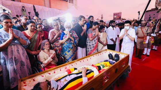 தேமுதிக தலைவர் விஜயகாந்த் 72 குண்டுகள் முழங்க முழு அரசு மரியாதையுடன் நல்லடக்கம் செய்யப்பட்டது.