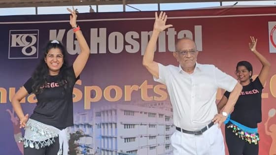 கோவையில் நடைபெற்ற விளையாட்டு தின நிகழ்ச்சியில் கலந்து கொண்ட மருத்துவர் பக்தவத்சலம் நடன கலைஞர்களுடன் இணைந்து பெல்லி டான்ஸ் ஆடி மகிழ்ந்தார்.