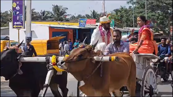 கோவையில் திருமணத்திற்கு பின்னர் புதுமண தம்பதிகள் மாட்டு வண்டியில் பயணம் செய்த வீடியோ காட்சிகள் சமூக வலைதளங்களில் வைரலாகி வருகிறது.