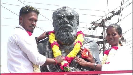 கரூரில் பெரியார் சிலை முன்பாக சுயமரியாதை திருமணம் செய்து கொண்ட இளம் ஜோடி