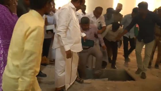 அப்போது எதிர்பாராத விதமாக சிமெண்ட் சிலாப் உடைந்து அதிகாரி கீழே விழுந்தார். அவர் அருகிலேயே நின்றுகொண்டிருந்த அமைச்சர் ஏ.வ.வேலு நுலிழையில் தப்பினார்.