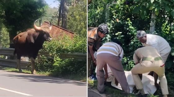 வாகனம் மோதி இறந்த குட்டி மாடு.. இறந்தது தெரியாமல் குட்டியை தேடும் தாய் காட்டு மாடு - வைரல் வீடியோ