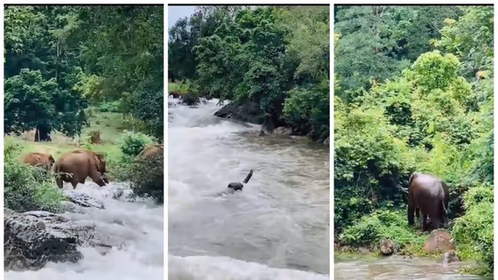 மற்ற இரு யானைகளும் செய்வதறியாது திகைத்து நின்ற நிலையில், சிறிது தூரம் பாறைகளுக்கு மத்தியில் அடித்துச் செல்லப்பட்ட காட்டு யானை நீந்தி, தத்தளித்து கரையோரம் வந்து தண்ணீரில் இருந்து வெளியேறி கரை பகுதிக்கு பாதுகாப்பாக சென்றது. சினிமா காட்சிகளை மிஞ்சும் இந்த பரபரப்பான காட்சிகள் தற்போது சமூக வலைத்தளங்களில் பரவி வருகிறது.