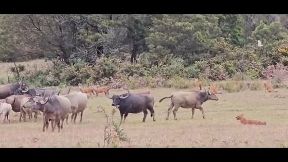 ஒவ்வொரு தோடர் பழங்குடியின மக்களும் வீட்டிற்கு பத்து எருமைகளை வளர்த்து வருகின்றனர். அவ்வாறு உதகை அடுத்த பைக்காரா புல்வெளியில் பத்துக்கும் மேற்பட்ட வளர்ப்பு எருமைகள் புல்வெளி மைதானத்தில் மேச்சலில் ஈடுபட்ட போது வனப்பகுதியில் இருந்து இறைத் தேடி வந்த 25க்கும் மேற்பட்ட செந்நாய்கள், எருமை கூட்டத்தில் புதிதாக ஈன்ற குட்டியை வேட்டையாட முயன்றது. இதனை அறிந்து சுதாரித்துக் கொண்ட அனைத்து எருமைகளும் ஒன்றுகூடி குட்டியை பாதுகாத்து செந்நாய்களை விரட்டியது காண்போரை நெகிழ வைத்தது.