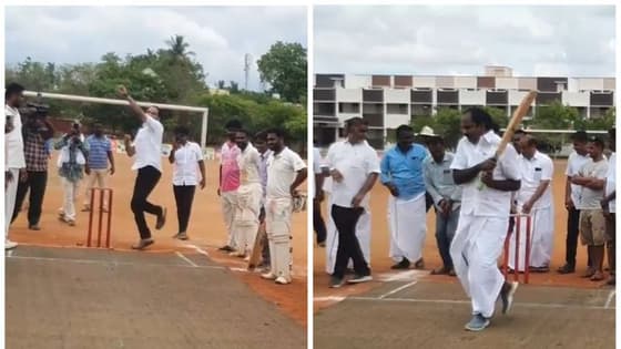 புதுக்கோட்டையில் நடைபெற்று வரும் கிரிக்கெட் போட்டியில் சட்டமன்ற உறுப்பினர் பந்து வீச, அமைச்சர் மெய்யநாதன் கிரிக்கெட் பேட்டால் பந்தையடித்து விளையாடி அசத்தினார்.