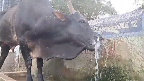 சிவகங்கை மாவட்டம் திருப்புவனம் பகுதியில் கடுமையான வெயிலால் நின்று கொண்டிருந்த காளை மாடு அங்கிருந்த குடிநீர் குழாயில் சொட்டு சொட்டாக வந்த தண்ணீரை முதலில் குடித்தது. ஆனால் தாகம் அடங்காததால் முழுமையாக வாயால் குழாயை முழுமையாக திறந்து தண்ணீர் குடிக்கத் தொடங்கியது. இதனை பார்த்த அந்த வழியாக சென்ற மாணவர் ஒருவர், மாடு சிரமப்பட்டு தண்ணீர் குடிப்பதை பார்த்து மாடு முழுமையாக தண்ணீர் குடிப்பதற்காக தனது கைகளை வைத்து தண்ணீரை காளைமாடுக்கு அருந்த செய்தார்.