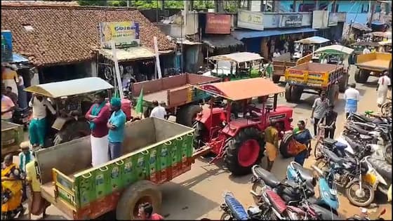 கர்நாடகா அரசை கண்டித்து தஞ்சையில் 500க்கும் மேற்பட்ட விவசாயிகள் டிராக்டர்களுடன் ஆர்ப்பாட்டம்