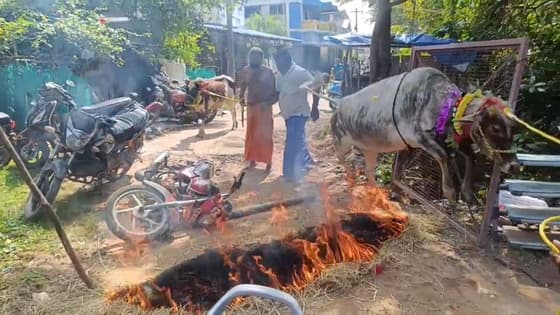நெருப்பை தாண்டி குதித்த மாடுகள்; திருவாரூர் பொங்கல் விழாவில் சுவாரசியம்