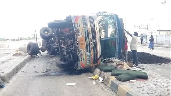 மது போதையில் அசுர வேகத்தில் இயக்கப்பட்ட லாரி சுங்கசாவடியில் கவிழ்ந்து விபத்து