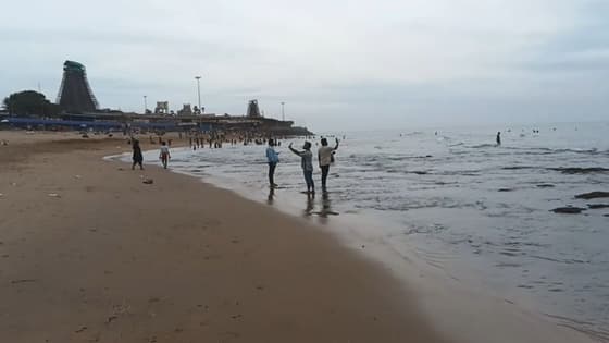 திருச்செந்தூர் அருள்மிகு சுப்பிரமணிய சுவாமி கோவிலில் கடல் சுமார் 100 அடி தூரத்திற்கு உள்வாங்கிய நிலையில் அலைகள் இன்றி குளம் போல் காட்சி அளிப்பதால் சுற்றுலாப் பயணிகள் மற்றும் பக்தர்கள் ஏமாற்றம் அடைந்துள்ளனர்.
