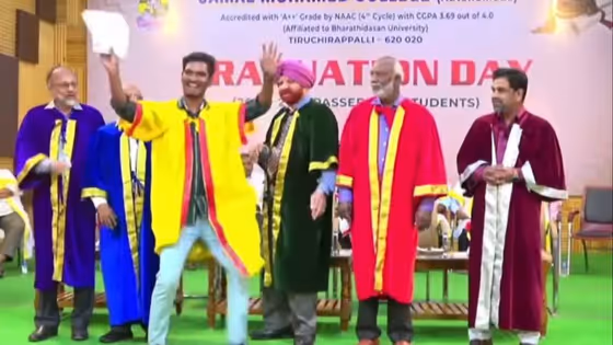 திருச்சி கல்லூரி பட்டமளிப்ப விழாவில் தாம் பட்டம் பெற்றதை மாணவர் ஒருவர் மேடையிலேயே நடனமாடி கொண்டாடிய வீடியோ வைரலாக பரவி வருகிறது.