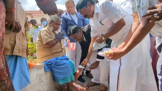தூய்மை பணியாளர்களின் கல்களை கழுவி பாத பூஜை செய் நீதிபதிகள் - உளுந்தூர் பேட்டை