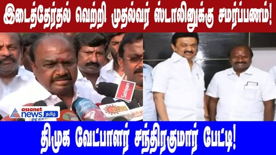ஈரோடு கிழக்கு இடைத்தேர்தல் வெற்றியை முதலமைச்சர் மு.க.ஸ்டாலினுக்கு சமர்ப்பிப்பதாக திமுக வேட்பாளர் சந்திரகுமார் தெரிவித்துள்ளார்.