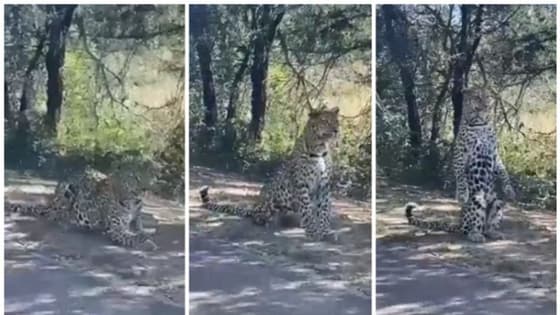 திம்பம் மலைப்பாதையில் சாலையின் குறுக்கே ஓடி விளையாடும் சிறுத்தை