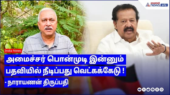 அமைச்சர் பொன்முடி ஒரு மோசமான நபர் . நான் இதை பேசும்பொழுது இதை விட தரைகுறைவாக பேச முடியும் ஆனால் என்னுடைய உணர்ச்சியை கட்டுப்படுத்திக்கொள்கிறேன் . தரம் தாழ்ந்த ஒரு நபரை இன்னும் அமைச்சராக தமிழகத்திலே வைத்திருப்பது வெட்கக்கேடானா ஒரு நிலை .தமிழக பெண்கள் மீது மிக மோசமான அவதூறை அல்லி வீசிருக்கிறார் அமைச்சர் பொன்முடி ..இன்னும் அவர் நீடிக்க வேண்டுமா ? என்று நாராயணன் திருப்பதி ஆவேசம் .