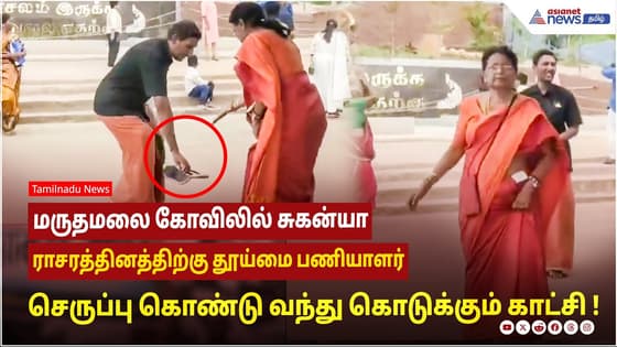 மருதமலை கோவிலில் சுகன்யா ராசரத்தினத்திற்கு தூய்மை பணியாளர் செருப்பு கொண்டு வந்து கொடுக்கும் காட்சி !