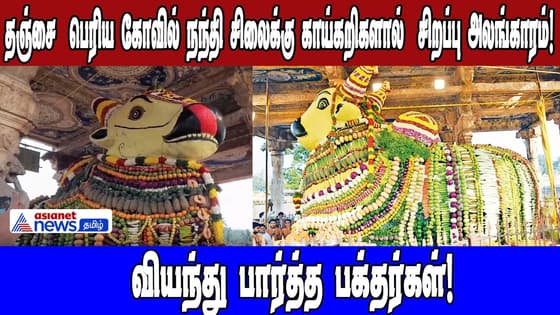 2000 கிலோ காய்கறி,பழங்கள்,இனிப்புகளால் அலங்கரிக்கப்பட்ட தஞ்சை பெரிய கோயில் நந்தி! பக்தர்கள் தரிசனம்!