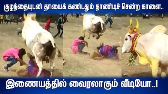 குழந்தையுடன் தாயைக் கண்டதும் தாண்டிச் சென்ற காளை.. இணையத்தில் வைரலாகும் வீடியோ..!