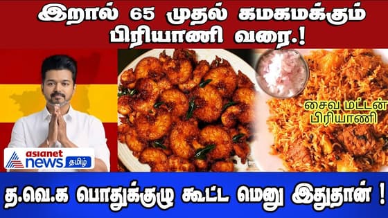தமிழக வெற்றிக் கழகத்தின் பொதுக்குழுக் கூட்டம் . கூட்டத்தில் வருபவர்களுக்கு உணவு தயார் செய்யப்பட்டிருக்கிறது . மதியம் 2500 பேருக்கு சுடச்சுட மதிய விருந்து வழங்கப்படவுள்ளது. அதில், 1.மால் பூவா ஸ்வீட், 2.வெஜ் சூப், 3.ஊறுகாய், 4.இஞ்சி துவையல், 5.தயிர் பச்சடி, 6.சப்பாத்தி+ பன்னீர் பட்டர் மசாலா, 7.வெஜ் மட்டன் பிரியாணி, 8..சாதம், 9..சைவ மீன் குழம்பு, 10.சாம்பார், 11.மிளகு ரசம், 12. இறால் 65, 13..அவியல், 14..ஆனியன் மணிலா, 15.பகோடா 16.உருளை பட்டானி வருவல், 17.தயிர் வடை, 18.அப்பளம், 19.வெத்தலை பாயாசம், 20. மோர், 21.ஐஸ்கிரீம் ஆகிய உணவுகள் தயாராகி வருகிறது.